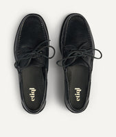 Handcrafted in Italy by ETIQL’s skilled artisans, the Morgan Black Boat Shoes deliver timeless versatility with a refined maritime touch. Made from supple black hammered calf leather and finished with a matching black non-slip rubber sole, this pair embodies casual sophistication designed for both coastal leisure and effortless city style.