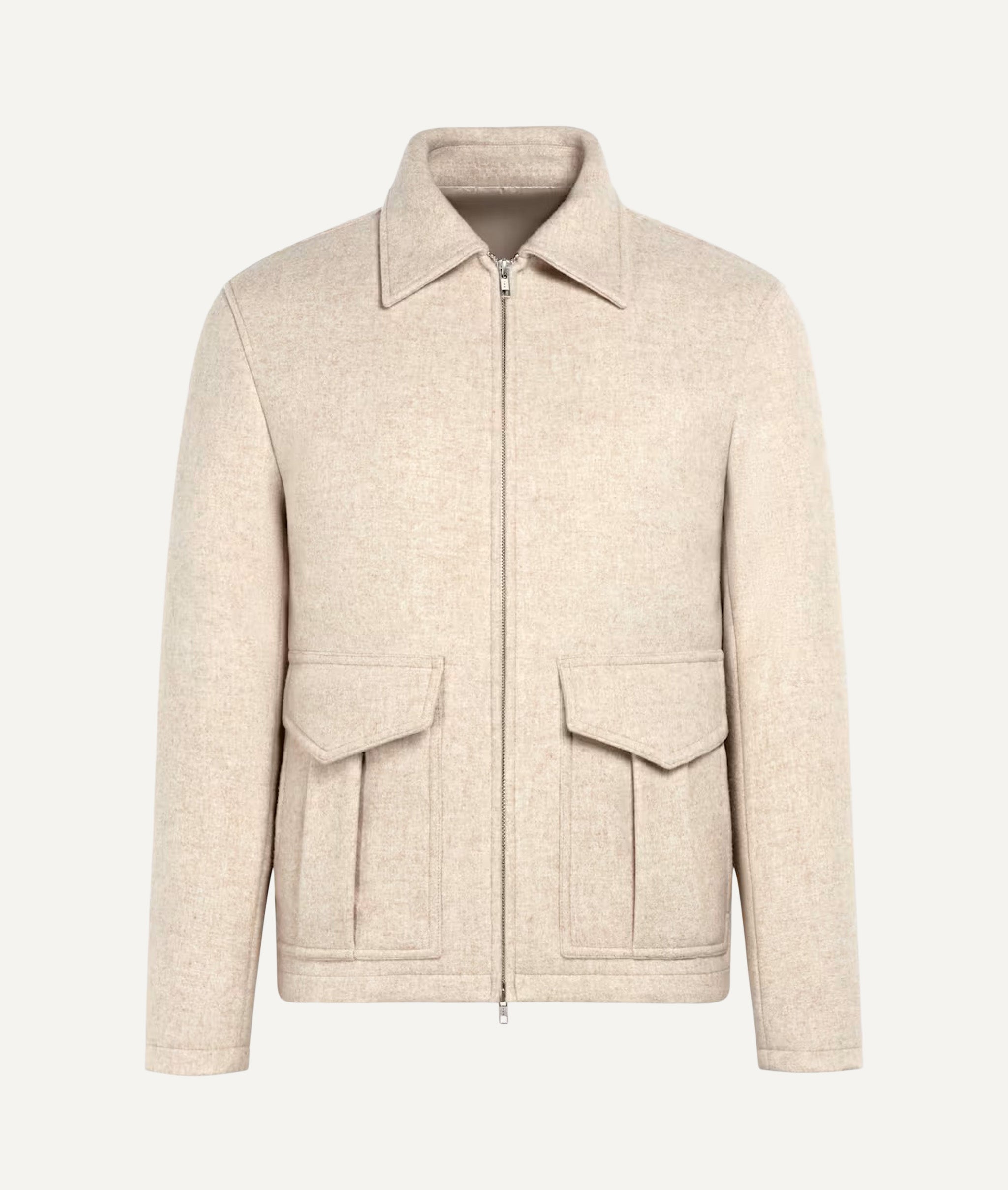 Handcrafted in Italy, the Bomber Jacket is tailored from water repellent heavy flannel woven by Vitale Barberis Canonico at 340gr/ml. Made from 100% wool, the fabric offers a soft brushed texture, natural warmth and a structured refined drape, creating an elevated casual silhouette with modern functionality and timeless character.